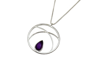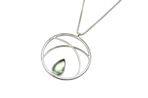This circle pendant necklace features a bright pear-shaped gemstone framed by criss crossing arcing lines. The arc pendant is high polished and is suspended on a box chain for a simple look that still feels special.