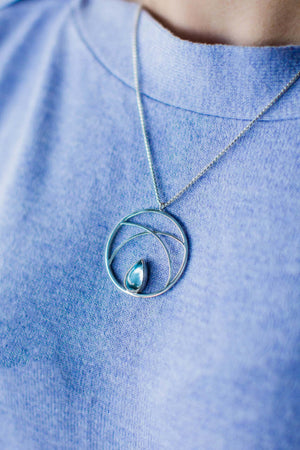 The circle and arc pendant measures 1.5" in diameter. Gemstone choices include a pale blue sky topaz, vibrant amethyst or pale green prasiolite (also known as green amethyst). The model in the photo is wearing a large arc pendant with sky topaz.