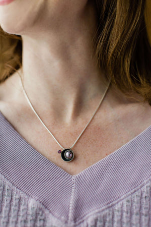 This gorgeous pearl planet pendant is a twist on the original Planet Pendant! This pendant features an 8mm AAA grade Tahitian pearl set in two pieces of oxidised domed silver. The oxidation allows the polished edges of the domes to beautifully frame the lavender pearl and make it really pop! The pearl planet pendant is offset with a lovely pink rhodolite garnet set in a 14k setting.