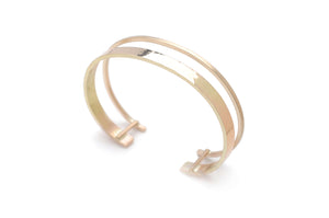 With this 14k gold cuff bracelet, women’s jewelry just got a little more sophisticated. This 14k gold multi strand bracelet has a hammered wide band that is high polished for a watery look. This band is paired with a thin band with a matte finish. The combination of size and textures offers pure luxury with a simple yet sophisticated look.