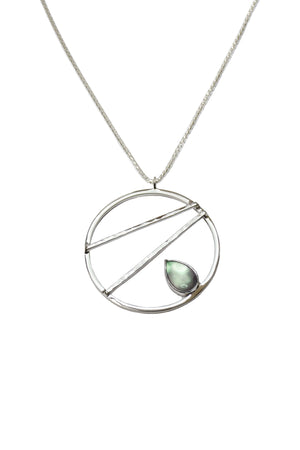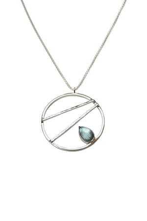 This piece takes a sterling silver crossbar necklace to the next level! The pendant features a small silver hoop with hammered bars flared across and a 10*8mm pear-shaped gemstone set in a custom setting. The silver hoop pendant is high polished for lots of shine, and the hammered crossbars add some texture and depth.