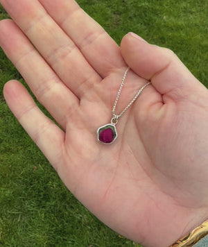 Simple pendant featuring a watermelon tourmaline slice with a beautiful raspberry centre and mint green edge. It's a thick slice so the light catches it differently at different angles for lovely richness. The beauty of a watermelon tourmaline slice is no two slices are the same!
