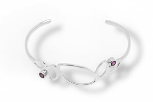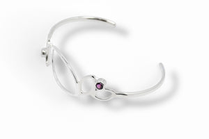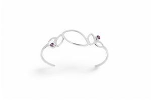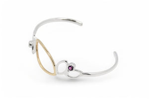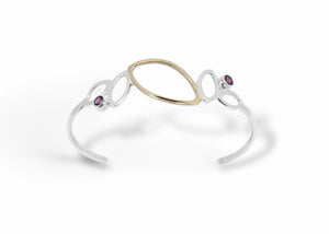 Delicate handcrafted leaf cuff available in either all sterling silver or with 1 large 14k yellow gold leaf and 4 smaller sterling silver leaves. Connected with silver bands and adorned with 2 rhodolite garnets. Very light cuff which is easy to wear. Available in 4 sizes to match your wrist for extra comfort.