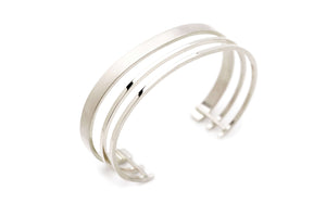 This multi strand cuff bracelet is by far our best seller!!! Handmade in sterling silver, , each band has a different finish for the multi-bangle look in an otherwise simple design. The wide band has a satin finish, and the two thin bands have one hammered and one polished. It is a simple and sophisticated look that is also easy to wear.