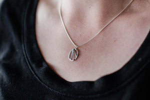 The handmade sterling silver pendant measures just over 3/4"long by 1/2" wide. The pendant is available suspended on a silver box chain in one of three lengths: 16”, 18” and 20”.