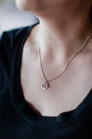 Love the look of our larger pentagon pendant but want it in a smaller size? Our mini pentagon pendant is the ultimate minimalist jewelry piece that still makes a statement. The unique pentagon shape and sterling silver crossbars make this piece stand out, despite its small size.