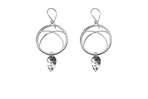 These elegant earrings are another take on a more traditional hoop. The arc hoop earrings feature a handcrafted sterling silver hoop with intersecting arcs shaped inside. A hammered silver petal hangs below the hoop for added texture and shine.