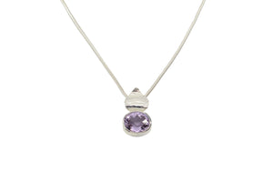 The floral-inspired amethyst pendant is suspended on a solid sterling silver snake chain. The pendant measures 1/2” wide by 1” long. The sterling silver necklace with amethyst is available on a 16”, 18” or 20” chain.