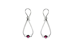 These garnet drop earrings are handmade in sterling silver wire, sterling silver and a garnet gemstone. The earrings measure about 1.5” long from the top of the french wire and about 1.2” wide at the base.