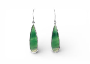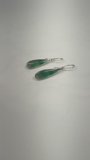 These long dangle earrings feature a translucent opalised wood long pear stone with opaque tips. The green catches the light and looks like the ocean with waves of darker and lighter greens.