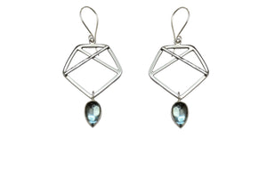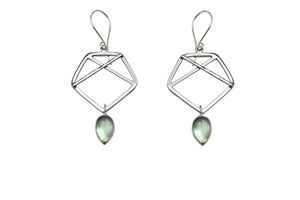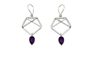 These pentagon shaped drop earrings feature a pear gemstone hanging at the base of the pentagon. The pentagon also features a criss-cross detail with a hammered piece overlapping a smooth piece, offering depth, texture and unique interest.