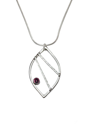 This leaf shaped pendant is handcrafted in sterling silver and measures 1 1/8" wide and 1 3/4" long. The pendant is available with a Swiss topaz, rhodolite garnet, peridot or amethyst gemstone so you can make it your own.