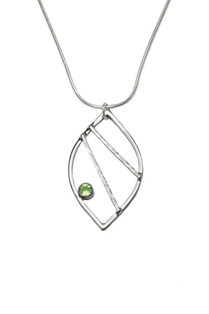 The lovely large leaf shaped necklace features two hammered crossbars for a contrasting texture, adding even more sparkle against the high polish as they catch the light. The leaf pendant is also accented by a 5mm gemstone for even more glimmer.