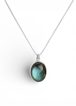 Small oval labradorite with an ocean blue flash that travels across the stone as the light moves. The stone looks different from all angles due to the labradorescence in this stone making it impossible to stop admiring it. Measures 1.7cm by 2.3cm.