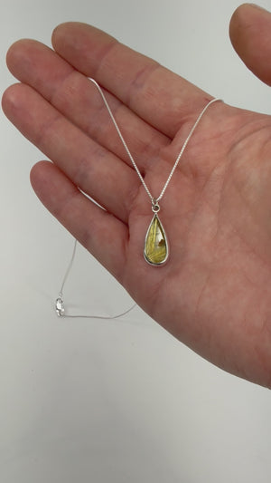 An example of an inclusion that makes a gem even more beautiful! The golden needle-like hairs catch the light as it moves for a beautiful effect. Set in a sterling silver bezel and suspended on a delicate rounded box chain.
