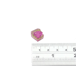 Thisloose watermelon tourmaline slice has more neon colors in it for a more vibrant color combination.  The hot pink center is surrounded by a lime green ribbon and a pale pink edge.  It has a jagged edge on one side which will be an interesting characteristic when surrounded by a bezel in yourcustom watermelon tourmaline ring.