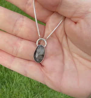 A modern sterling silver pendant featuring a beautiful rose cut silver sheen obsidian.  The silver sheen travels across the stone following the light.