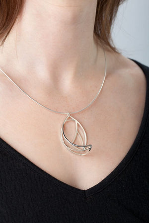 The abstract three dimensional pendant features an arcing sterling silver design that really stands out (literally). When worn against the skin, the pendant stands out from the body for an eye-catching look.