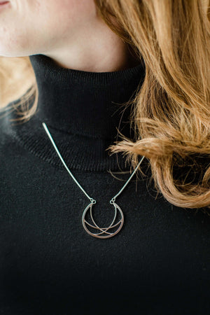 This is a simple necklace that really makes a statement! The silver crescent necklace features a large crescent shape accented with intertwining wires within the piece. While the overall design is simple and perfect for everyday wear, it’s definitely the kind of piece that draws attention - so be prepared to tell people where you got it!