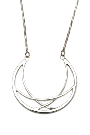 Handcrafted in sterling silver, this crescent pendant measures 1.5" by 1.5". It is suspended on a sterling silver snake chain and is available in 16", 18", 20" and 22" lengths.
