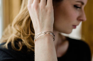 This piece proves that even a minimalist jewelry design can really stand out. This woven sterling silver bracelet features three unique strands of high quality sterling silver. This woven metal bracelet includes three bands with three contrasting finishes: high polish, peen hammered and bark-like texture.