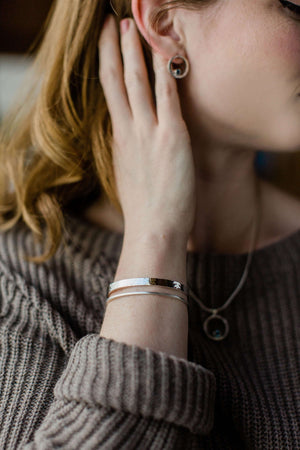 This sterling silver bracelet has a hand-hammered wide band that is high polished for a watery look. It’s paired with a thin band with a matte finish for a combination of textures.