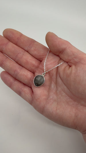 A modern sterling silver pendant featuring a beautiful rose cut silver sheen obsidian.  The silver sheen travels across the stone following the light.