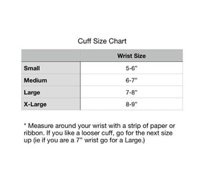 One of a kind cuff can be sized for small, medium, or large.  Please refer to the cuff sizing guide to get your correct size.  If you require a custom size please let me know.