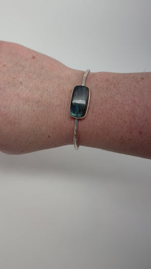 Rectangle Labradorite is handcrafted and set in sterling silver on a hammered sterling silver cuff. The stone has a gorgeous bright blue flash as your wrist moves.  The labradorite has interesting striations throughout the top of the stone creating a cool pattern effect.  The band is a 2mm square silver wire with varying hammered patterns on the top and sides.