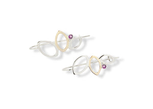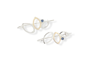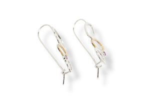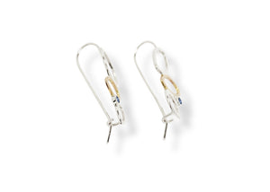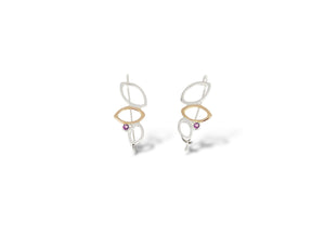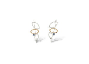 The falling leaves drop earrings feature 3 leaves - 2 in sterling silver and one shaped in 14k yellow gold - cascading down in a dangling style earring and accented with 3mm rhodolite garnet or Montana sapphire. Delicate fine jewellery that is gorgeous dressed up but secure enough with a hook to wear at any time. Lightweight you won't even feel you're wearing them, it's a perfect addition to your collection for a timeless look.